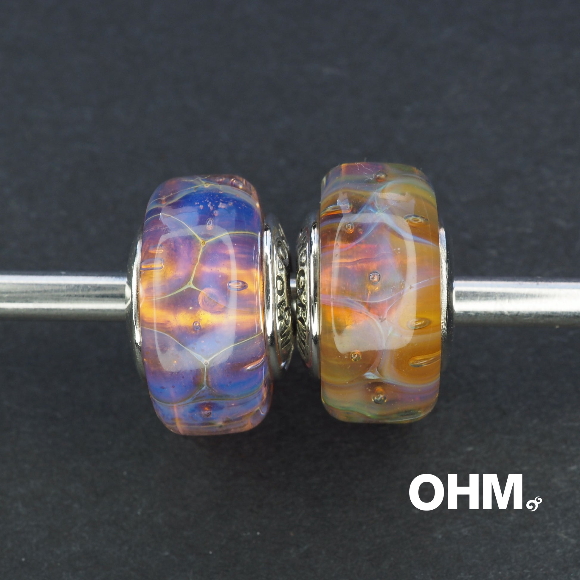 A mesmerizing dance of dusk and flame. This glass bead blends deep violet twilight with warm amber hues, capturing the magic of a sky where day and night meet. Subtle crackled textures shimmer like lightning in glass, making each piece uniquely alive.